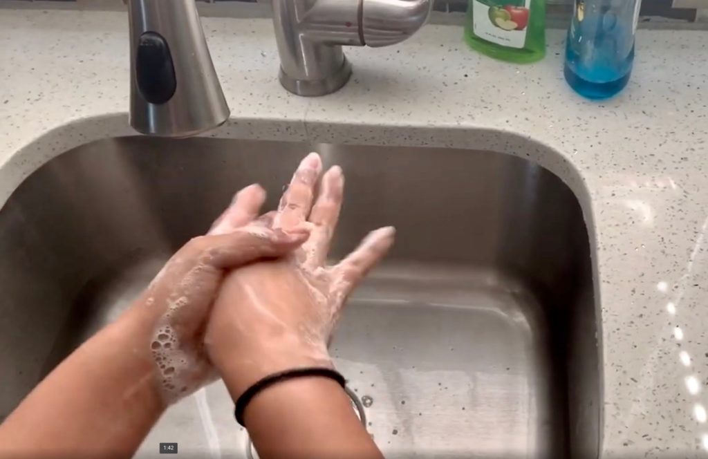(above) In a screenshot from the first episode of Linden High School’s student news show since remote learning began, junior Katherine Flores shows proper hand-washing technique.